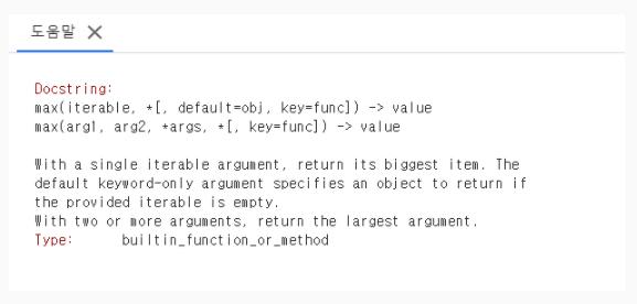 max라는 커멘드에 ? 를 붙이게 되면 max 요약정보 및 사용법이 있는 위 사진과 같은 Docstring이 나타난다.