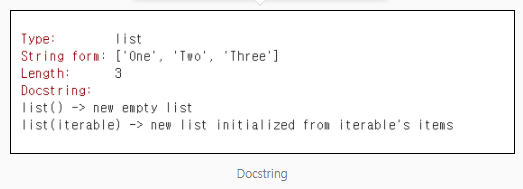 : 객체 요약 정보 및 사용법이 있는 docstring 을 볼 수 있다.