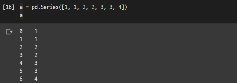 1, 1, 2, 2, 3, 3, 4 의 값을 가진 a라는 Series를 생성해보았다.