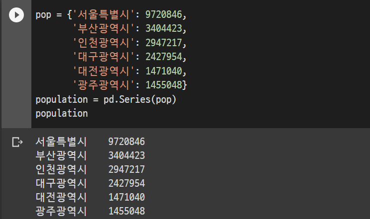 딕셔너리 값을 통째로 Series로 입력이 가능하다.