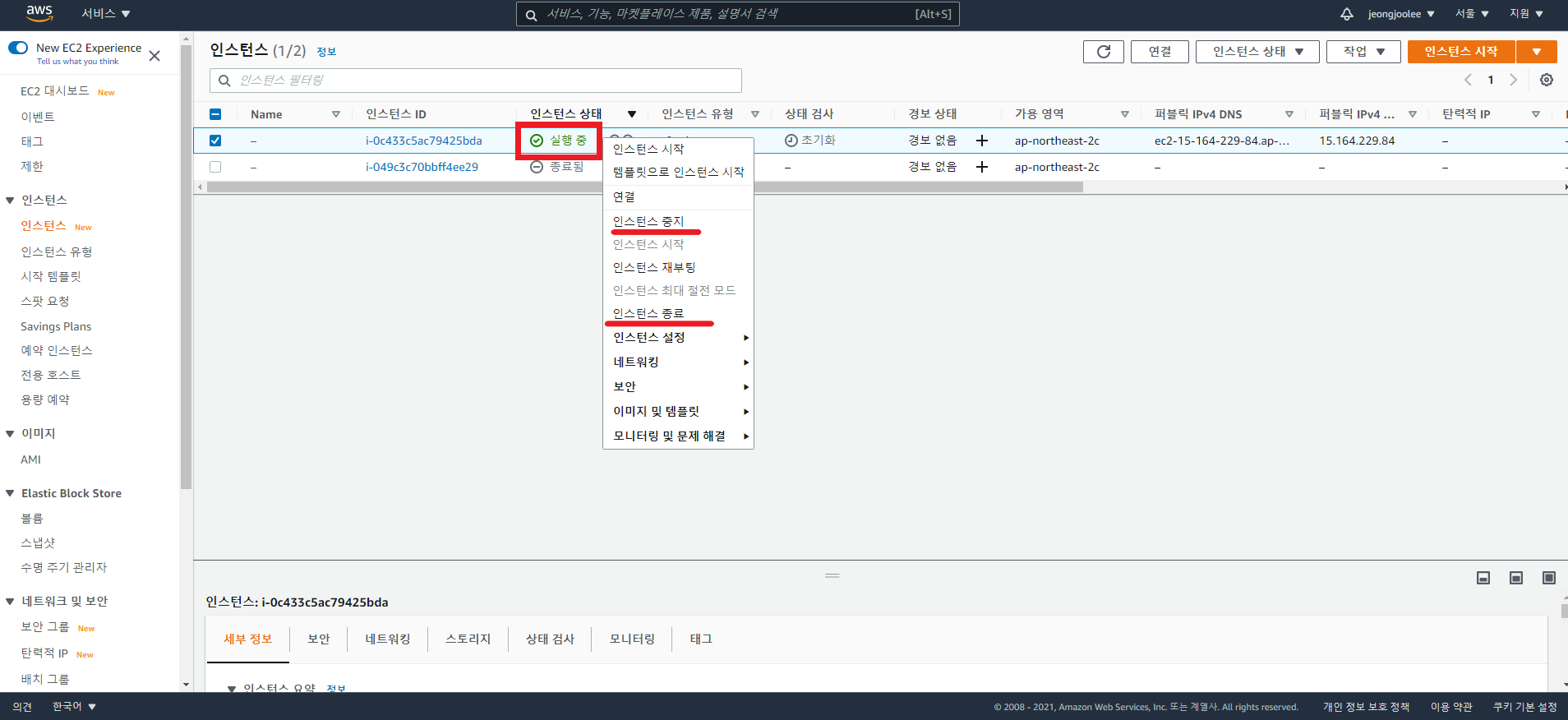 - 인스턴스 종료 : 완전 종료, 재실행 불가, 다시 새롭게 설치해야 한다.