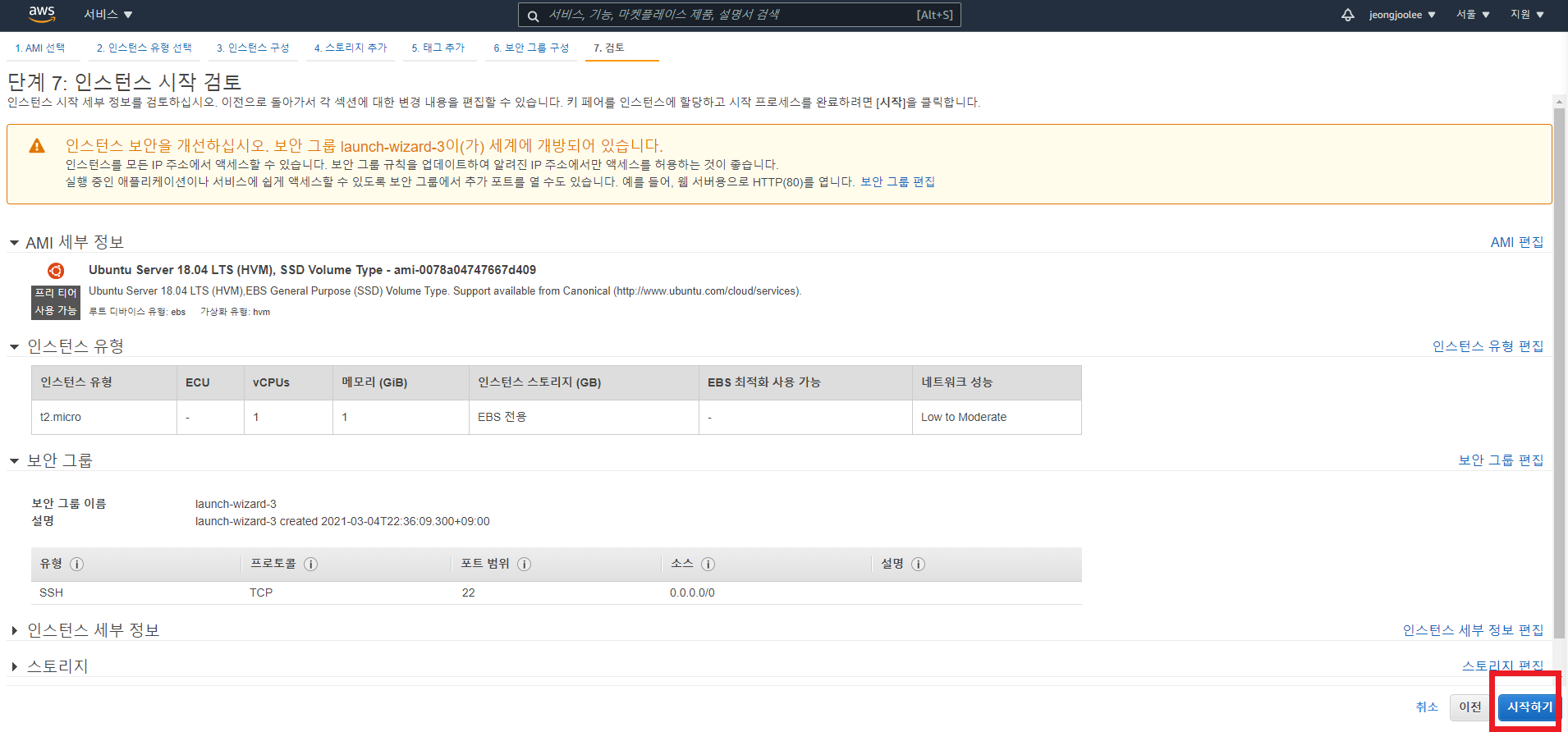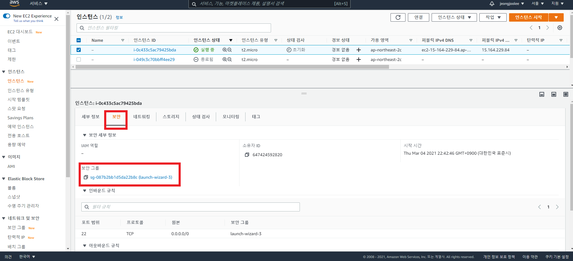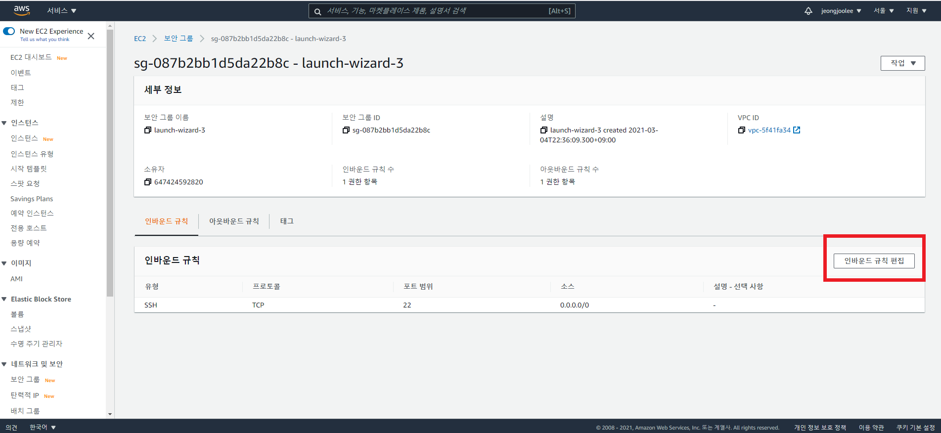 AWS에서 막아놓은 포트를 몇 가지만 열어두기 위해 보안 - 보안그룹 이동
