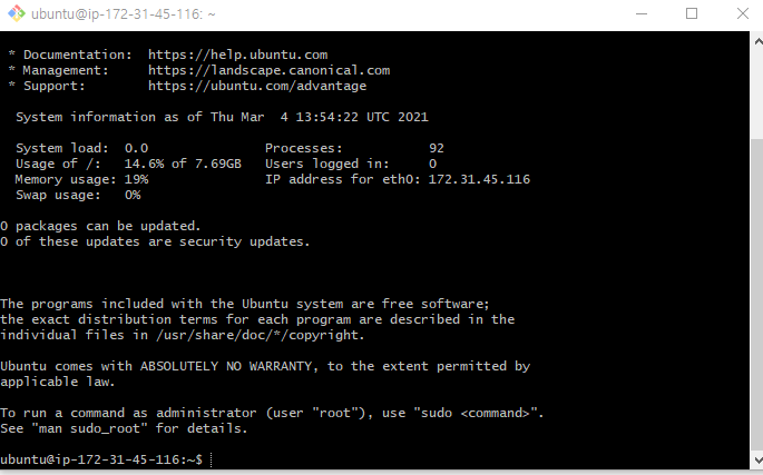 가장 아래 줄이 ubuntu@ 로 시작하면 원격 접속이 완료된 상태이다.