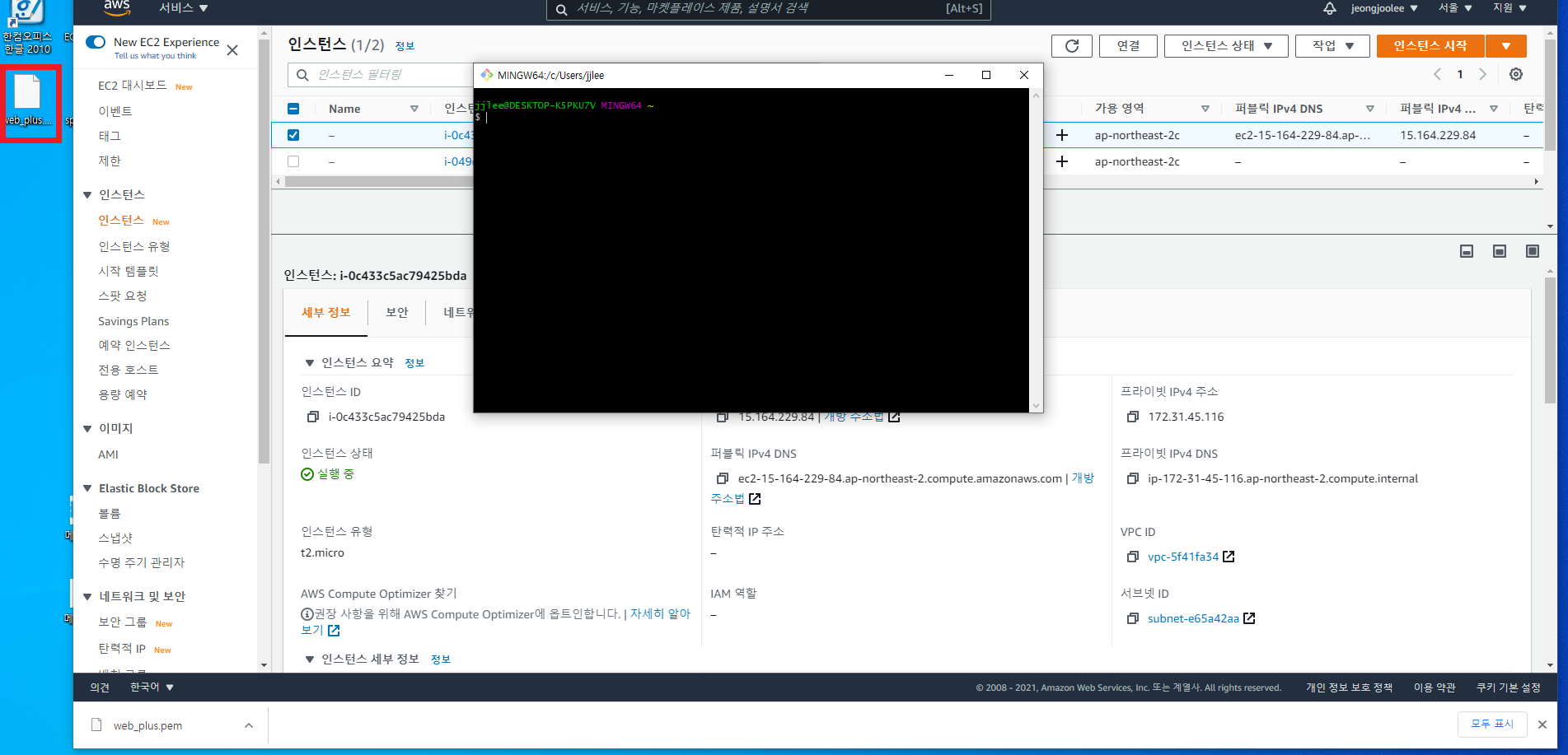 *이전에 고이 저장해둔 키페어 파일을 터미널에 올리면 글자가 형성된다.