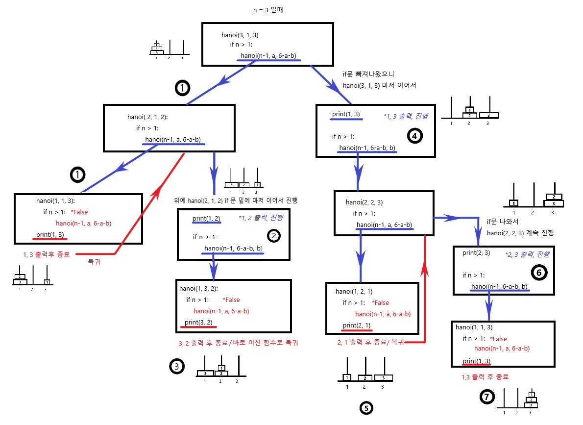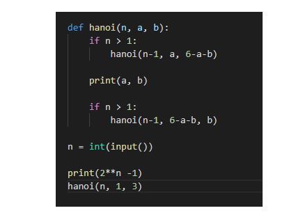 hanoi(n-1, a, 6-a-b) # 기둥이 1개 이상이면 그룹으로 묶인 n-1개 원판을