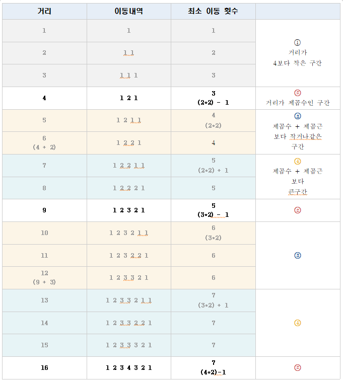그럼 이제 입력한 값들사이의 거리에 따라 반복패턴 중 어디구간에 속해 있는지 확인만 되면 쉽게 최소 이동 횟수를 구할 수 있다.
