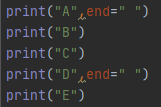 = A의 출력값(1번째)에 end="" 문이 붙어 그 다음 출력값인 B와 이어지게되어 A B 가 붙어서 나오게되었다.