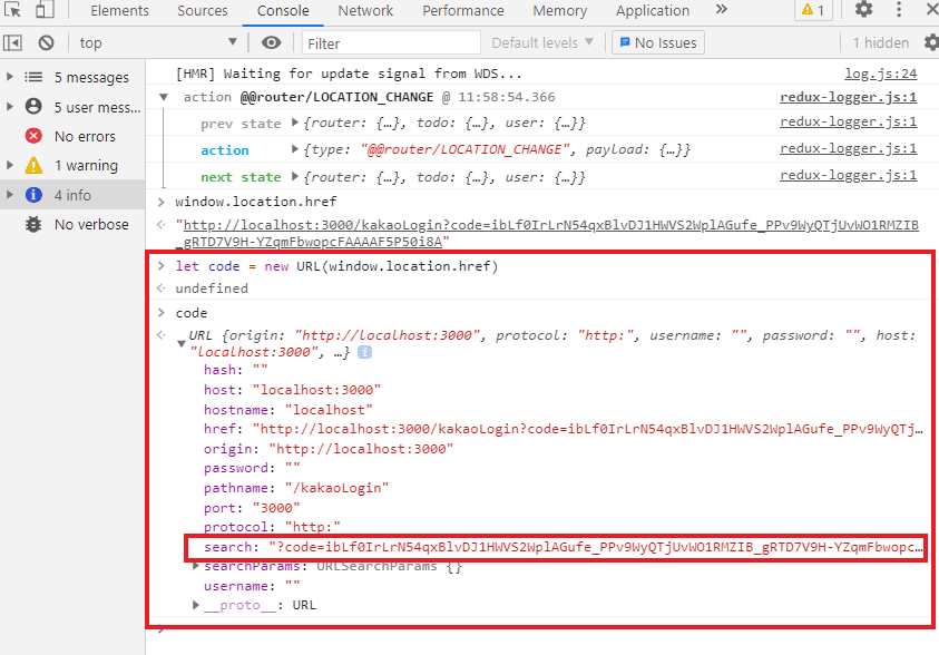 잘 보면 search라는 파라미터 안에 인가 코드가 예쁘게 잘 담겨있는 것을 알 수 있다.