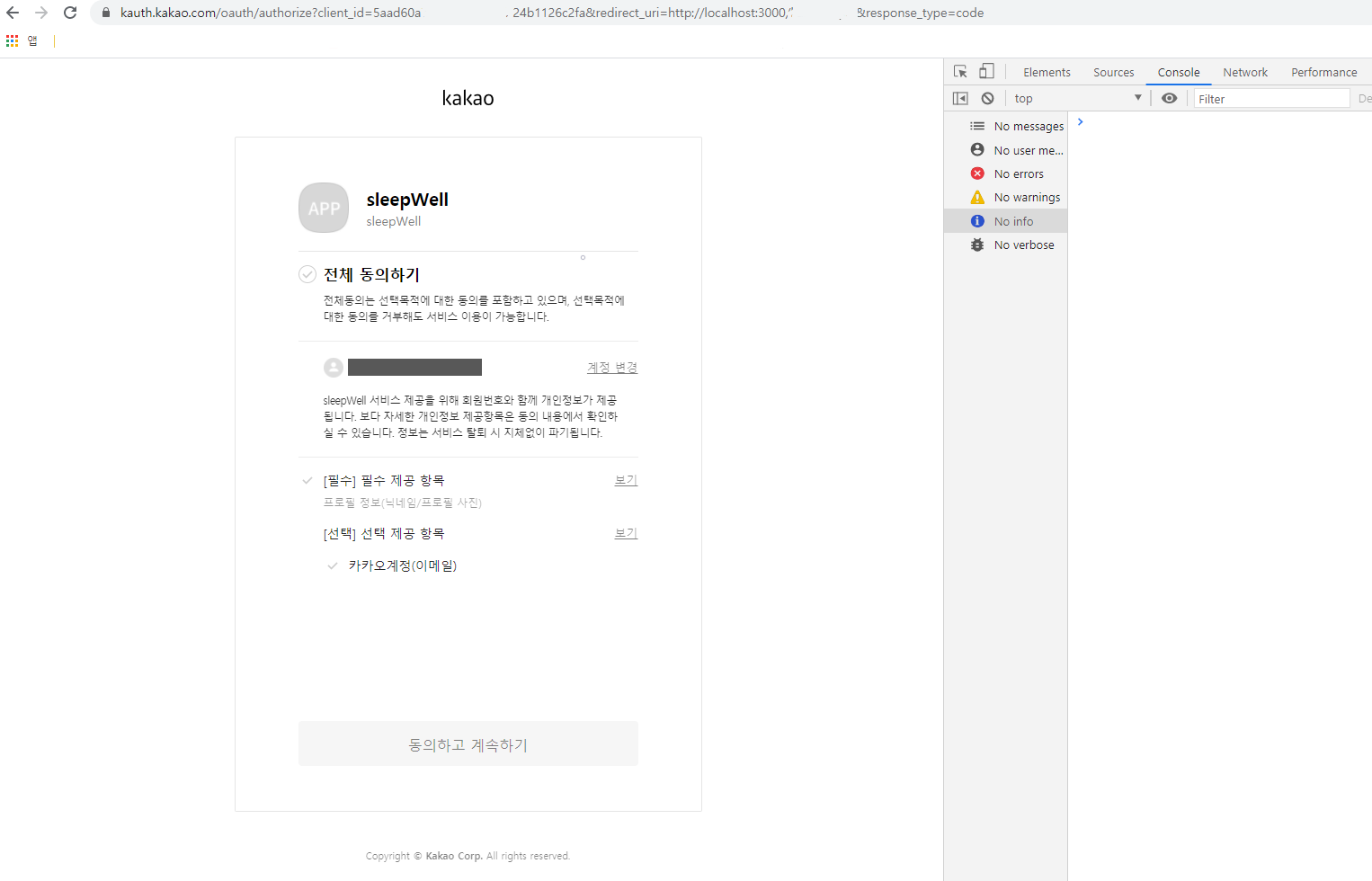 위에 명시됐듯이 cliend_id와 redirect_uri를 받아와서 {REST_API_KEY}와 {REDIRECT_URI}에 채워주어야 한다.