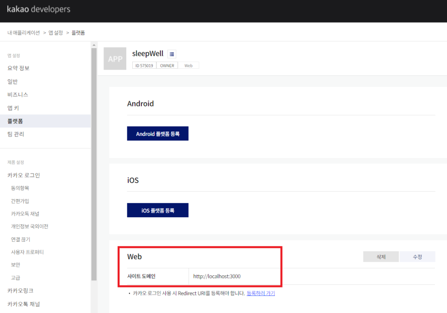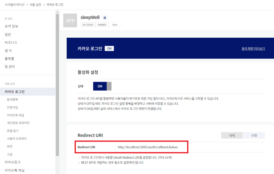 Redirect URI는 카카오 로그인 메뉴에 들어가서 추가를 해준다. 이때 경로 설정은 백엔드와 협의해서 맞춘다.