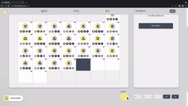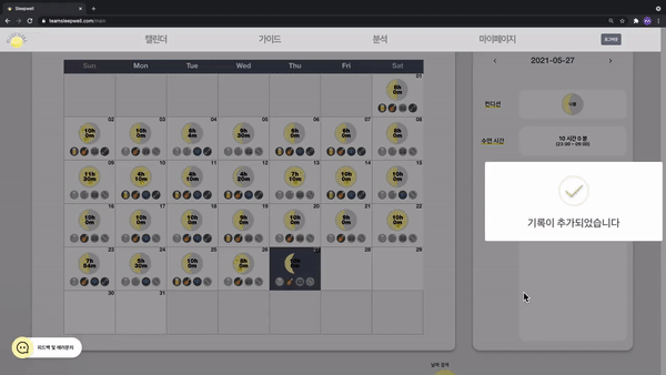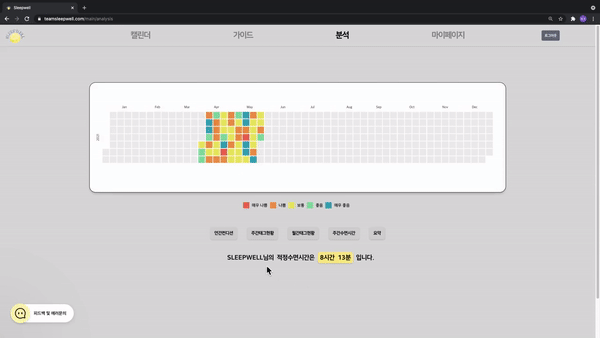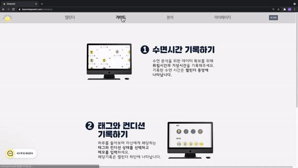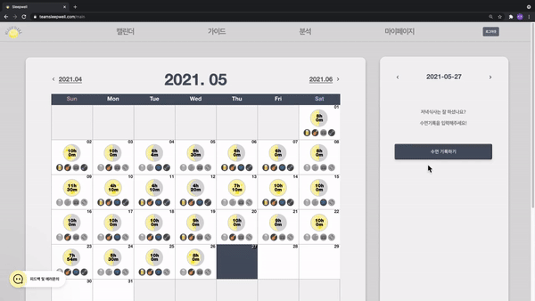 사용자에게 맞는 개인 수면시간을 알아보기 위해 수면시간을 쉽게 기록할 수 있는 서비스를 제공하고 ‘나는 얼마나 자면 컨디션이 좋은가’를 알 수 있는 분석 결과를 제시한다.