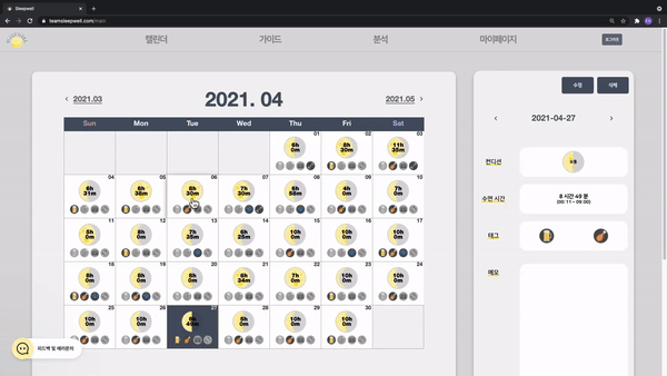 - 프로젝트 소개 : 그날 수면한 시간과 컨디션, 수면에 영향을 미치는 태그 등을 기록함으로써 개개인에 맞는 적정 수면시간을 제공합니다.