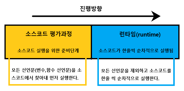 자바스크립트 엔진은 소스코드를 한 줄씩 순차적으로 실행하기 앞서(runtime 이전) 먼저 소스코드의 평가과정을 거치면서 소스코드를 실행하기 위한 준비를 한다.