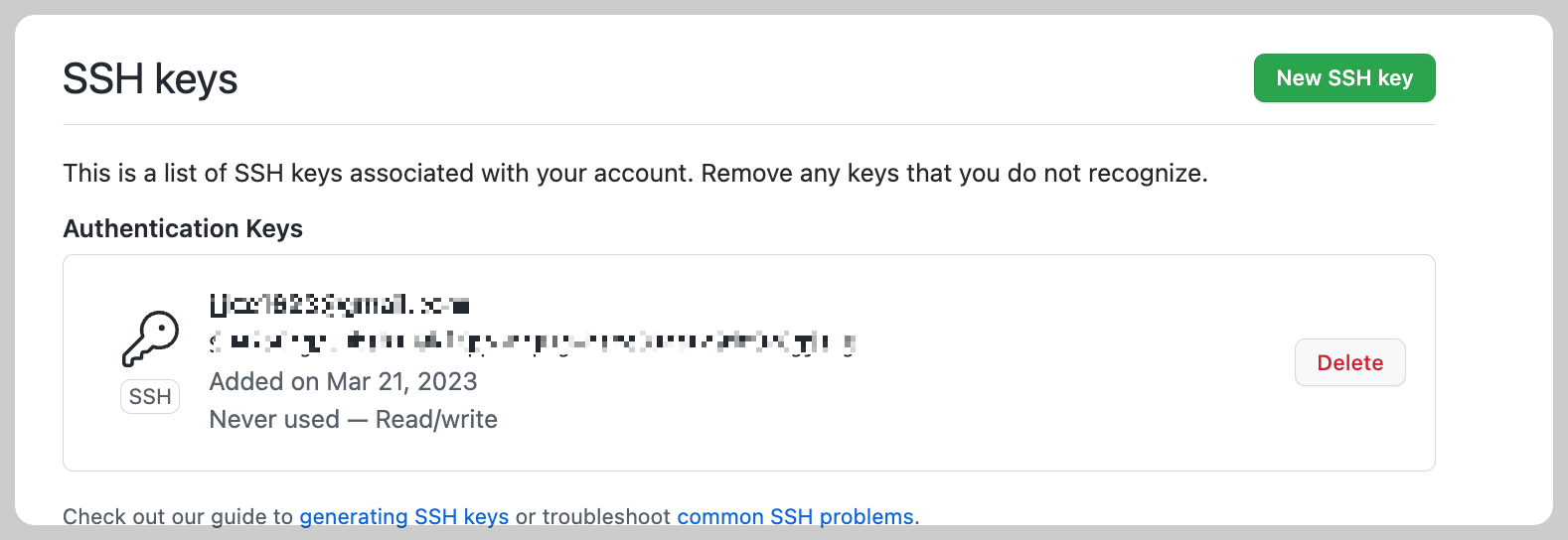 5. New SSH key 버튼을 눌러서 Key 입력란에 복사한 내용을 붙여 넣는다.