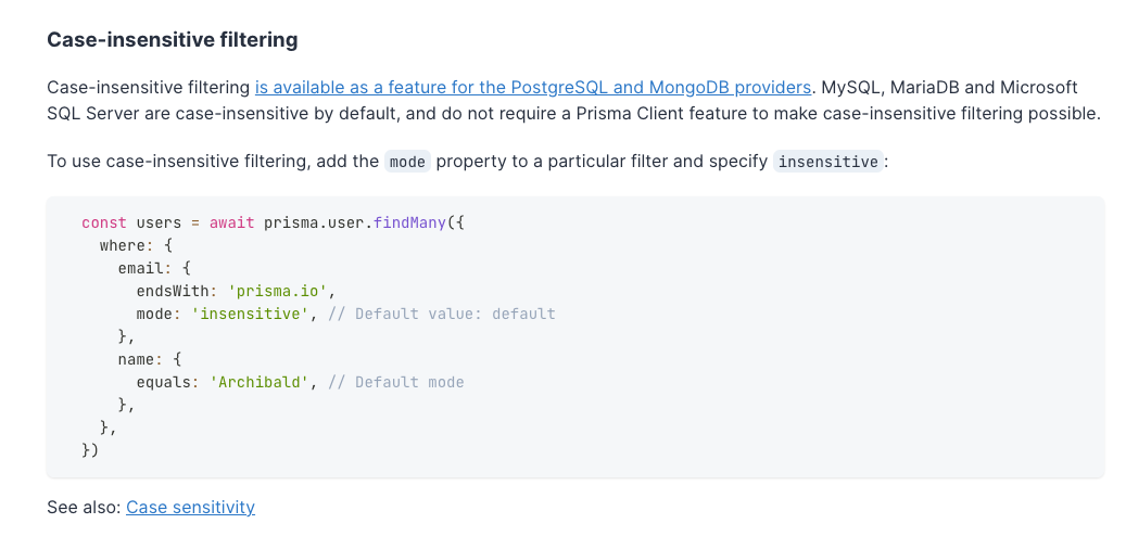 PostgreSQL이 기본적으로 대소문자를 구분하기때문에 구분없이 탐색을 위해 위와같은 대소문자 구분없이 탐색하게 하려고 넣었던것이었는데 prisma 문서에서 알게된사실이 하나 있었다.